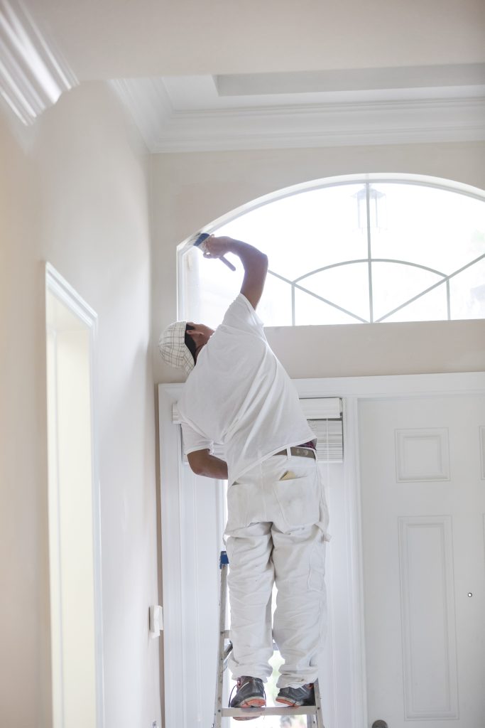 Real hispanic painter painting around the window above the front door of a home that is being redecorated. He is using an angled paint brush to avoid getting paint on the window. Real situation with real people. He is on a ladder. in shot taken with Canon 5D Mark 3.